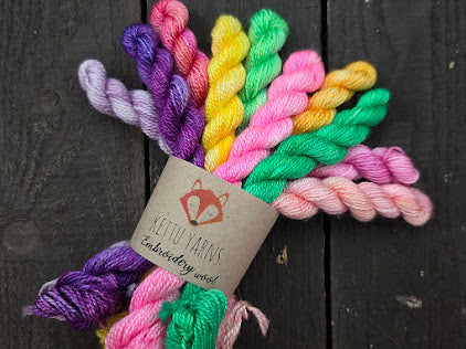 De smukke farver fra Kettu Yarns er mere "solid", som det hedder på engelsk, altså mere rolige og mere ens i tonen end håndfarvede garner med mange farvevariationer. Dermed fuldender de vores store udvalg af håndfarvede garner, hvor du kan finde alt fra de mere rolige toner, over de mere varierede til de vildeste farveorgier. Find vores store udvalg her.