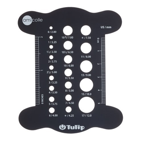 Med dette praktiske og solide værktøj kan du altid måle din pindestørrelse, hvis tallene er slidt af eller, for nogle af os, svære at se . Ydermere har pindemåleren en strikkefasthedsmåler på siden. Farven er dyb blågrå. Pindemåleren er et uundværligt værktøj i strikketasken, såvel som strikkefasthedsmåleren.