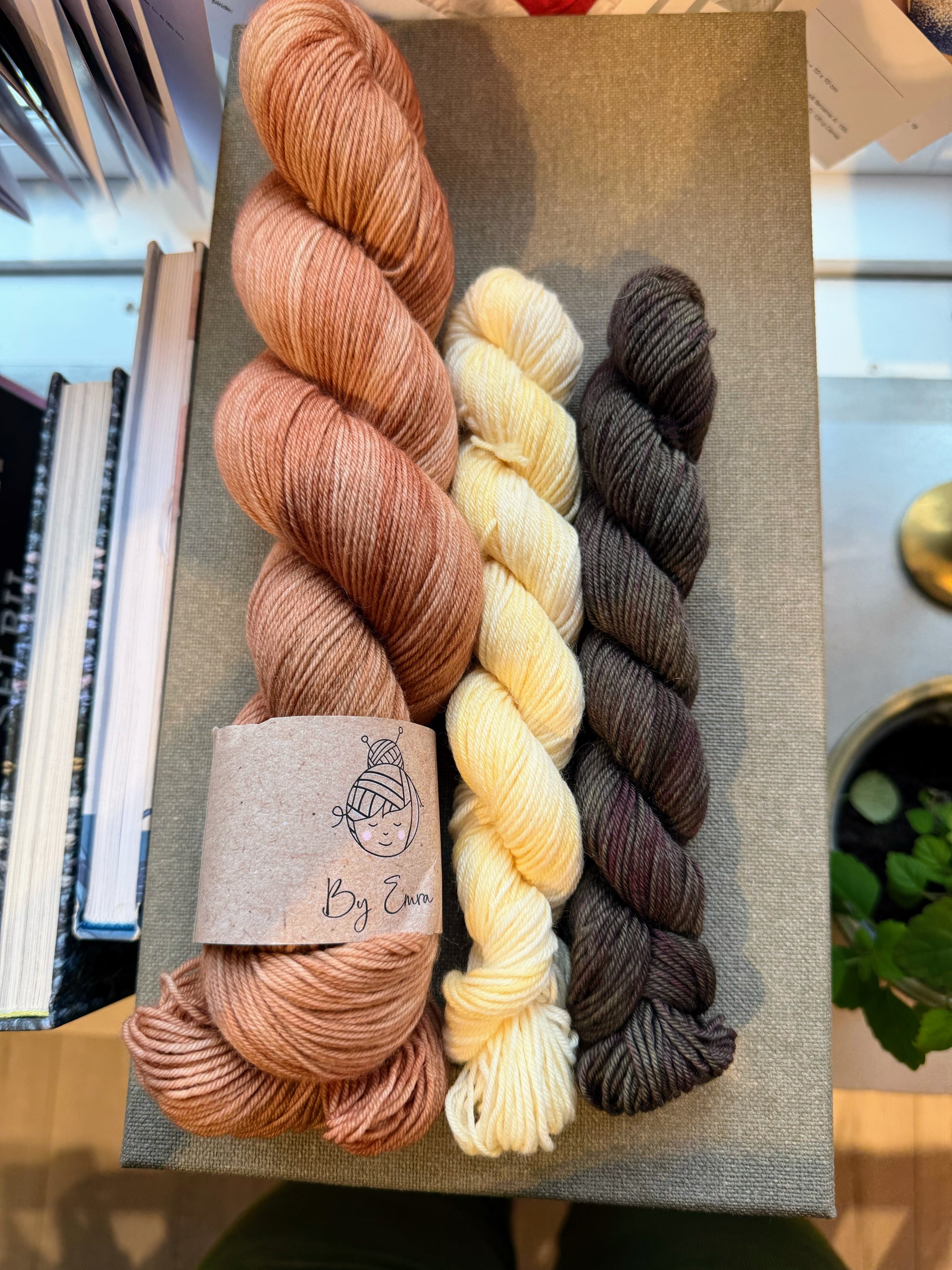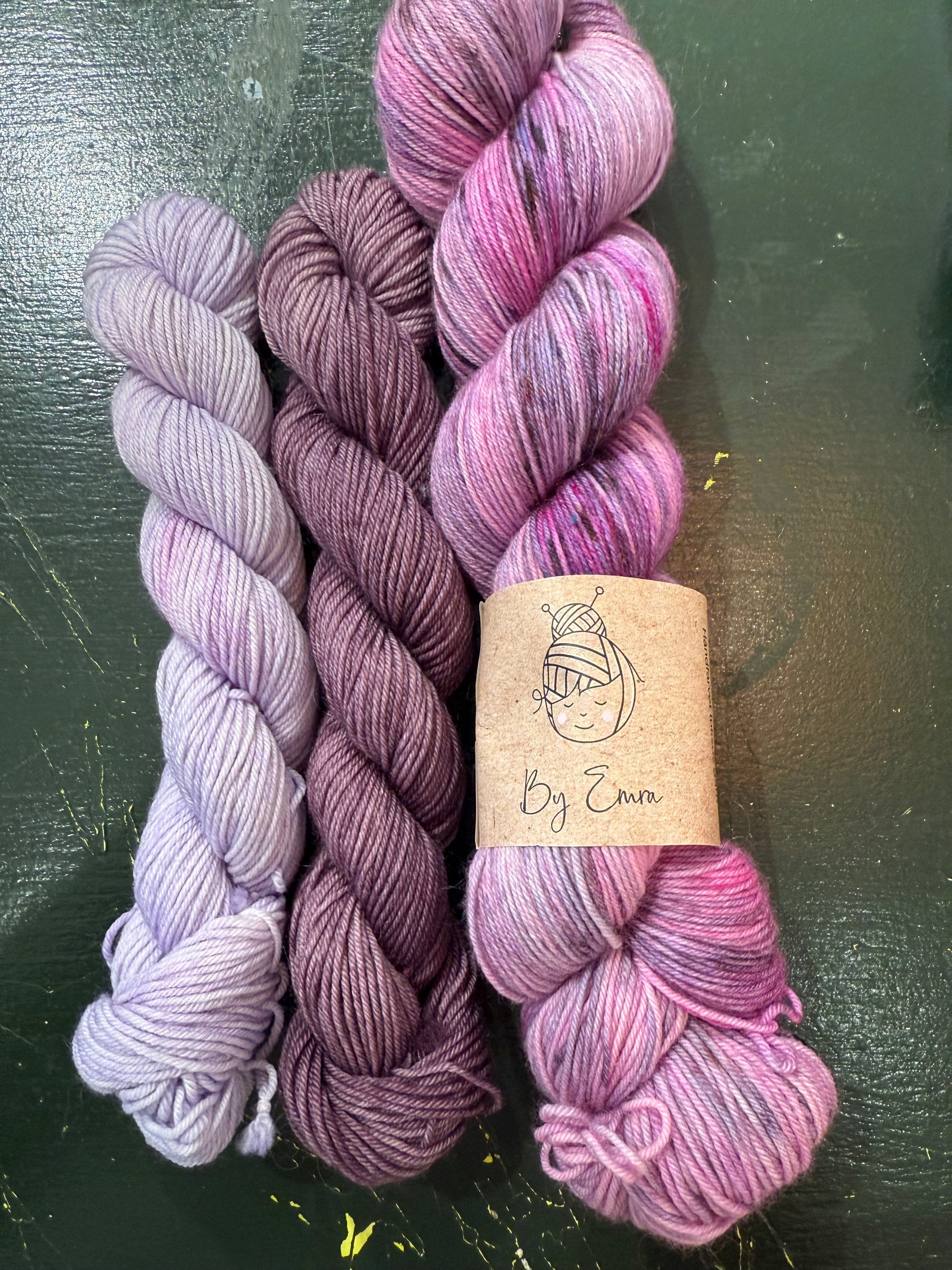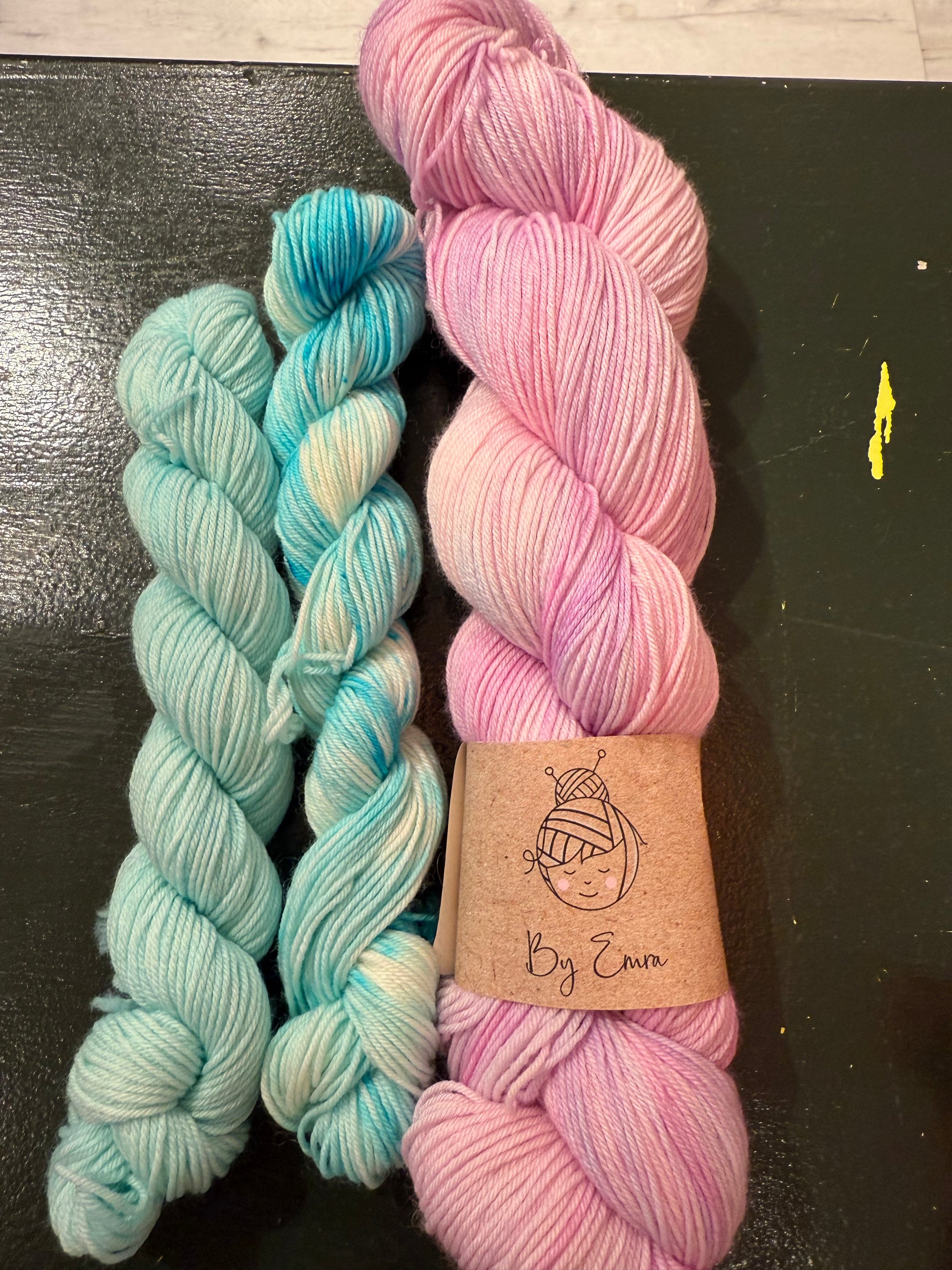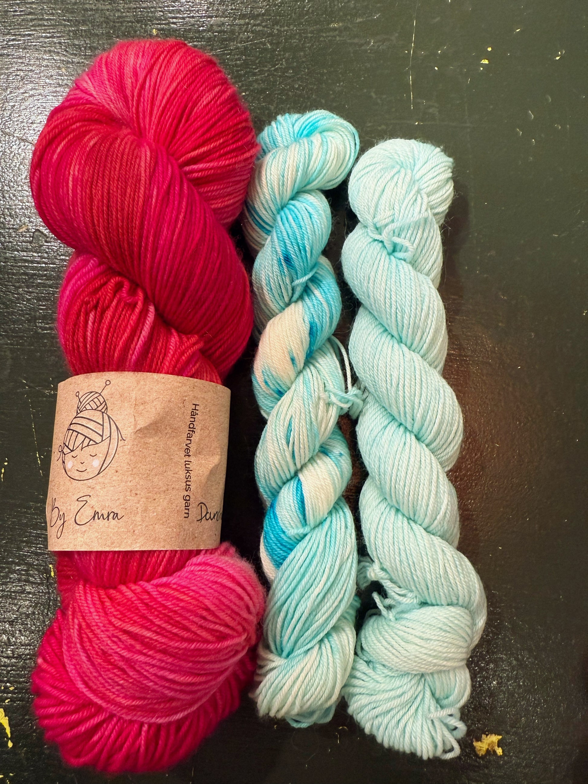 Kit med 400 meter håndfarvet strømpegarn plus to mini-fed til fx hæl og tå eller striber i ribben. Alt farvet af By Emra; høj kvalitet i både farver og garn. Kittet er også oplagt som gave og kommer fint pakket ind i cellofan.