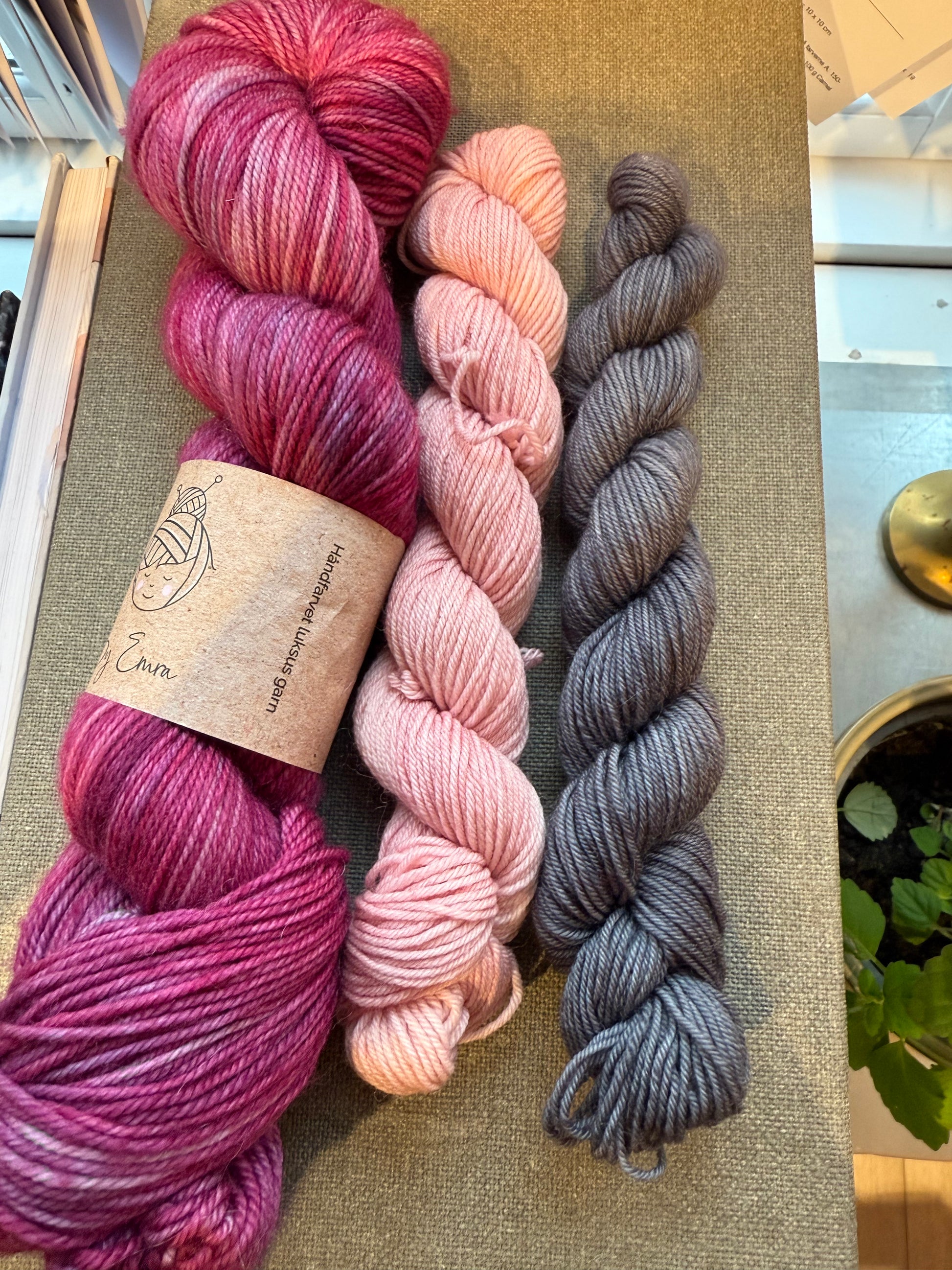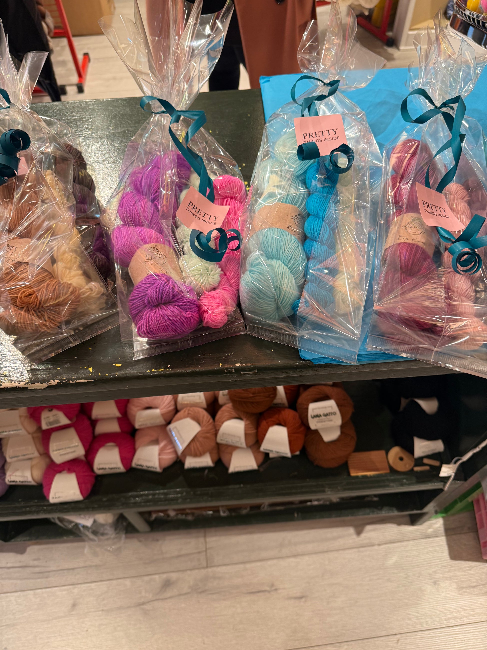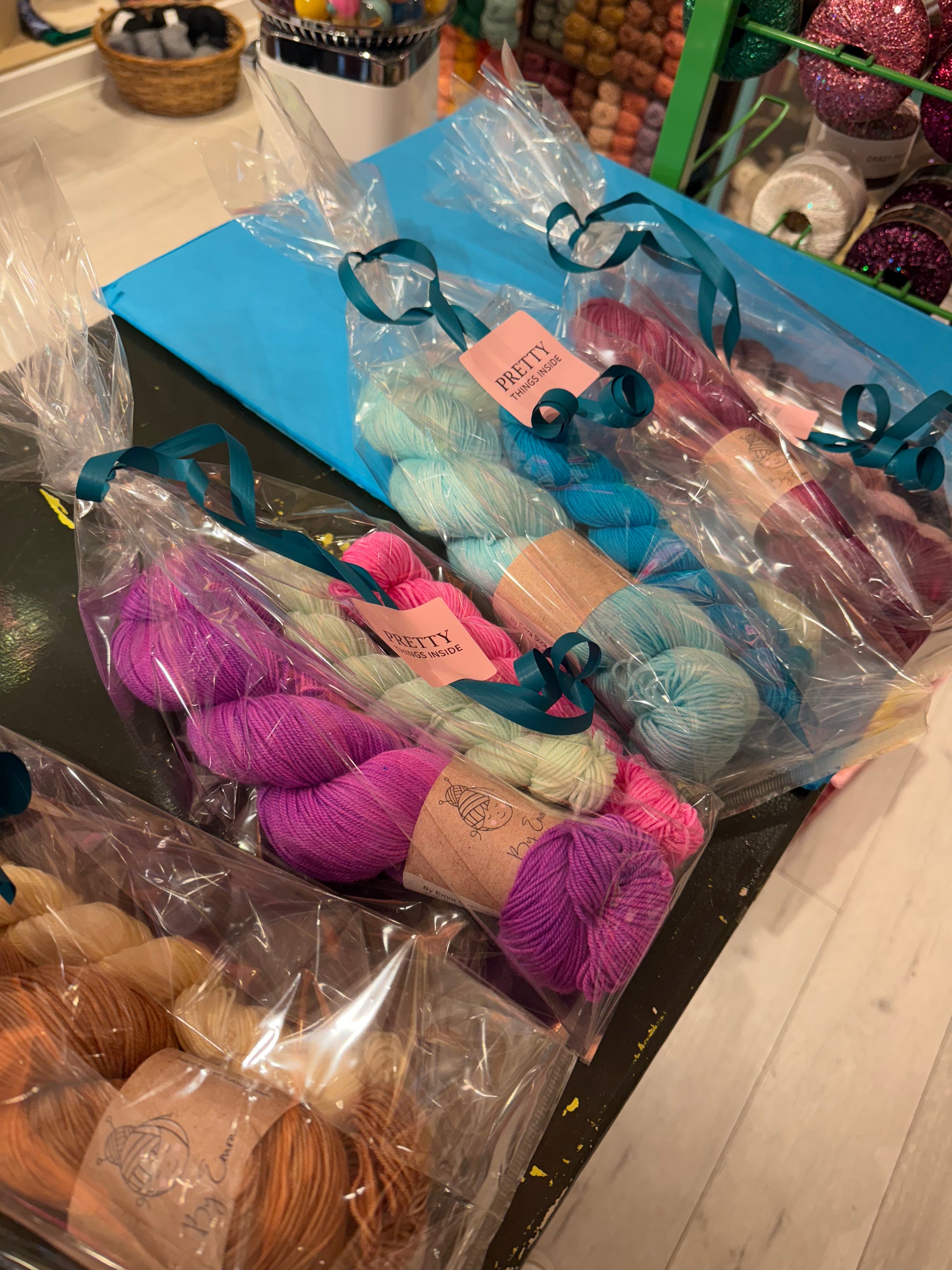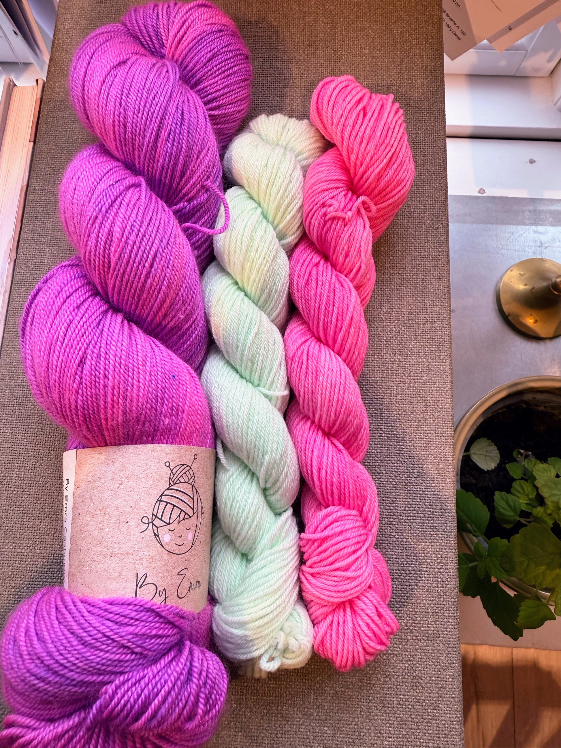 Kit med 400 meter håndfarvet strømpegarn plus to mini-fed til fx hæl og tå eller striber i ribben. Alt farvet af By Emra; høj kvalitet i både farver og garn. Kittet er også oplagt som gave og kommer fint pakket ind i cellofan.